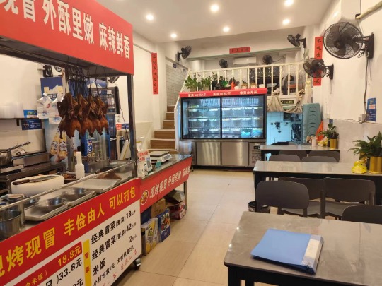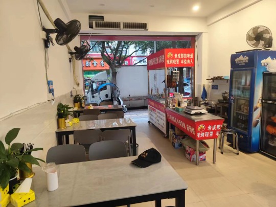 1.店铺面积55平方米,租金4200元/月,转让费5.8万。店铺现在经营餐饮冒菜店,店铺正常营业中,店内设备证件齐全。店铺内精装修,有阁楼。门口外摆区域比较大,可以随便外摆。